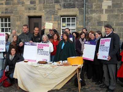 I was up in St Andrews today meeting students and staff. Whilst there I was invited to come along and enjoy some cake in a lunchtime protest with a difference. Staff from the UCU [University College Union] were protesting at management plans to eat away at their pension rights.